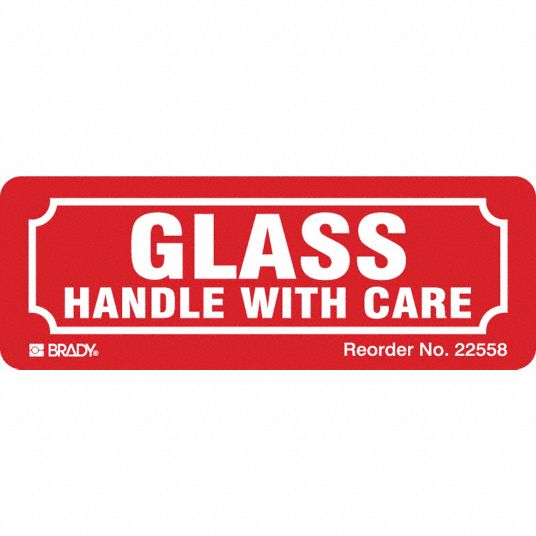 Glass Handle With Care | Packaging & Transport Labels | Safety Signs Glass Handle with Care $50.00 150 x 75mm of 500 labels per roll Packaging & transport labels can help you with quality assurance, handling, packing, and more. From fragile stickers, to acceptance and rejection labels, our range of labels can help you keep control of your stock and manage things at your business. Fragile Glass Handle with Care Stickers & Shipping Labels Fragile Glass Handle with Care Stickers call attention to fragile shipments that contain glass. Bright red and white labels feature two arrows that indicate which side needs to remain up to avoid damaging the contents. These eye-catching shipping labels use a semi-glass pressure-sensitive material with permanent adhesive.