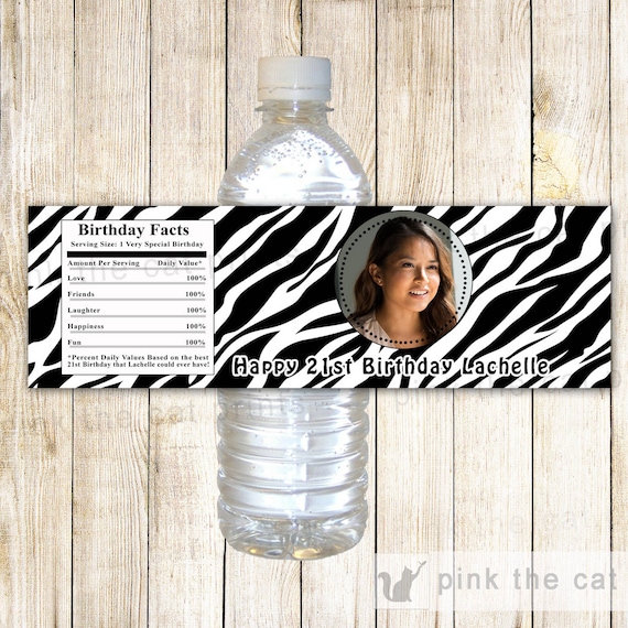 Zebra Water Bottle Labels Wrappers - Black White Adult Birthday Party Photo Decorations Printable Favor Label Any Age